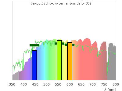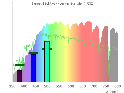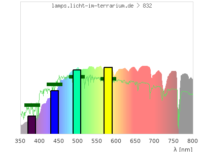 Erythema 0.00219 UV-Index Pyrimidine dimerization of DNA 0.0128 µW/cm² Photoceratitis 0 µW/cm² Photoconjunctivitis 0 µW/cm² DNA Damage 9.58E-6 Vitamin D3 5.31E-5 µW/cm² Photosynthesis 179 µW/cm² Luminosity 720 lx Human L-Cone 108 µW/cm² Human M-Cone 88.4 µW/cm² Human S-Cone 39.6 µW/cm² CIE X 94.9 µW/cm² CIE Y 100 µW/cm² CIE Z 75.2 µW/cm² PAR PPFD 12.3 µmol/m²/s Extinction preD3 0.04 e-3*m²/mol Extinction Tachysterol 0.181 e-3*m²/mol Exctincition PreD3 58.3 m²/mol Extinction Lumisterol 0 m²/mol Exctincition Tachysterol 873 m²/mol Extinction 7DHC 0 m²/mol L-Cone 93.7 µW/cm² M-Cone 90.4 µW/cm² S-Cone 61.3 µW/cm² U-Cone 25.4 µW/cm² UVR - ICNIRP 2004 0.00144 Rel Biol Eff Melatonin Supression 64.6 µW/cm² Blue Light Hazard 44.9 µW/cm² (62.3 µW/cm² per 1000 lx) CIE 174:2006 PreVit D3 0 µW/cm² Lumen Reptil 661 "pseudo-lx" Vitamin D3 Degradation 0.0115 µW/cm² Actinic UV 0.00144 µW/cm² (0.0201 mW/klm) Exctincition Lumisterol 1.21 m²/mol Exctincition 7DHC 0.148 m²/mol Exctincition Toxisterols 27.8 m²/mol